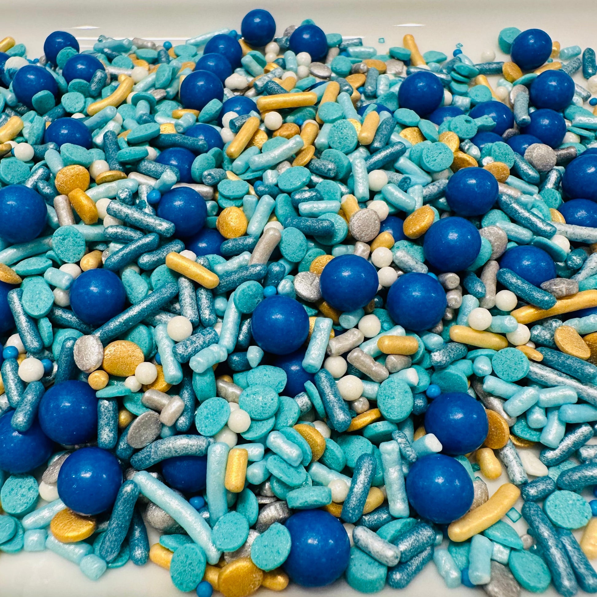 A vibrant mix of blue, gold, white and silver sprinkles perfect for decorating cakes, cookies and more. Deluxe mix offers a fully edible variety of different shaped and sized sprinkles, quins, nonpareils, pearls, and sanding sugars.